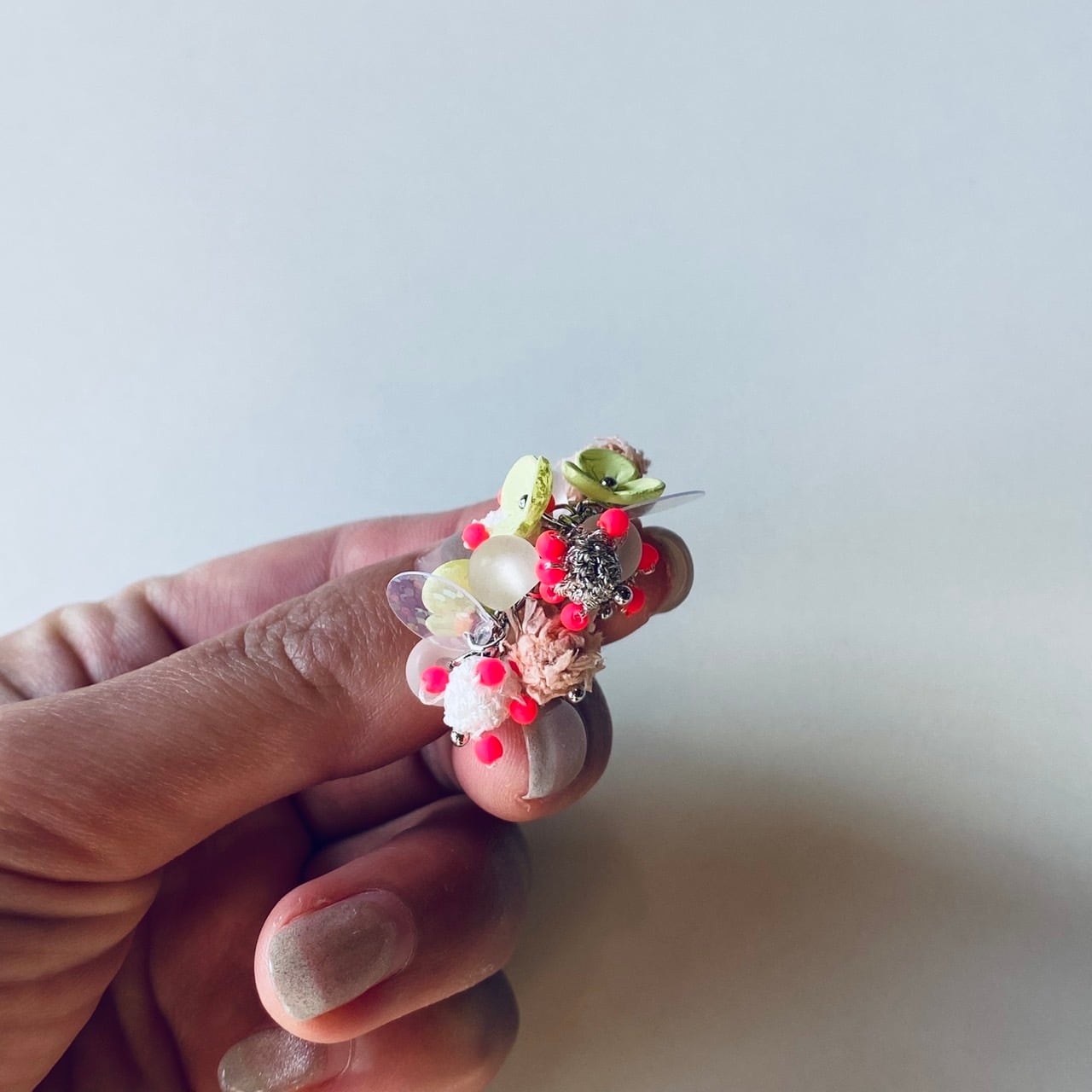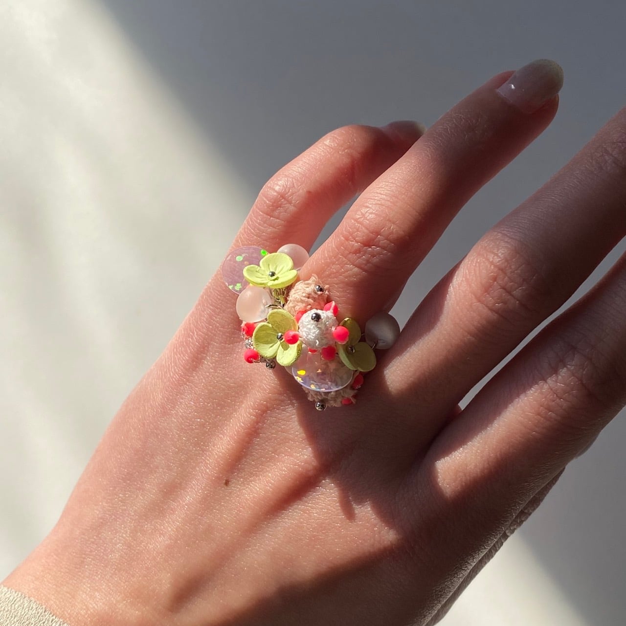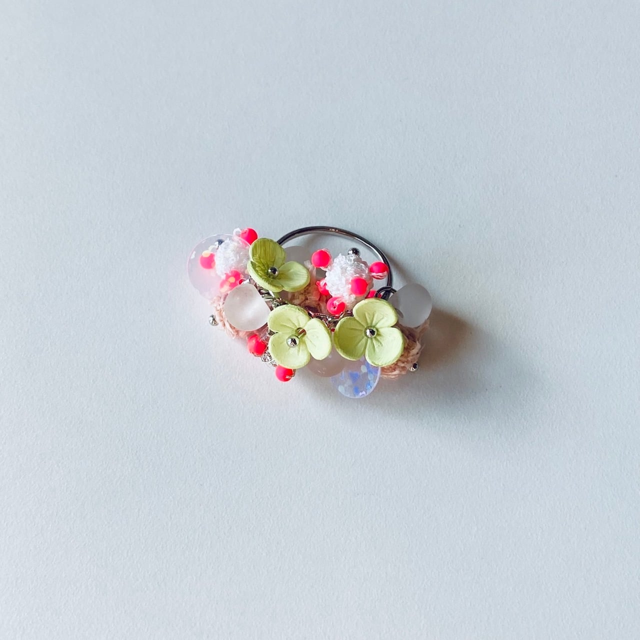 手編みで作られたボールや、スパンコール、手作業で色が塗られたお花のパーツがふんだんにあしらわれたリング。