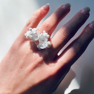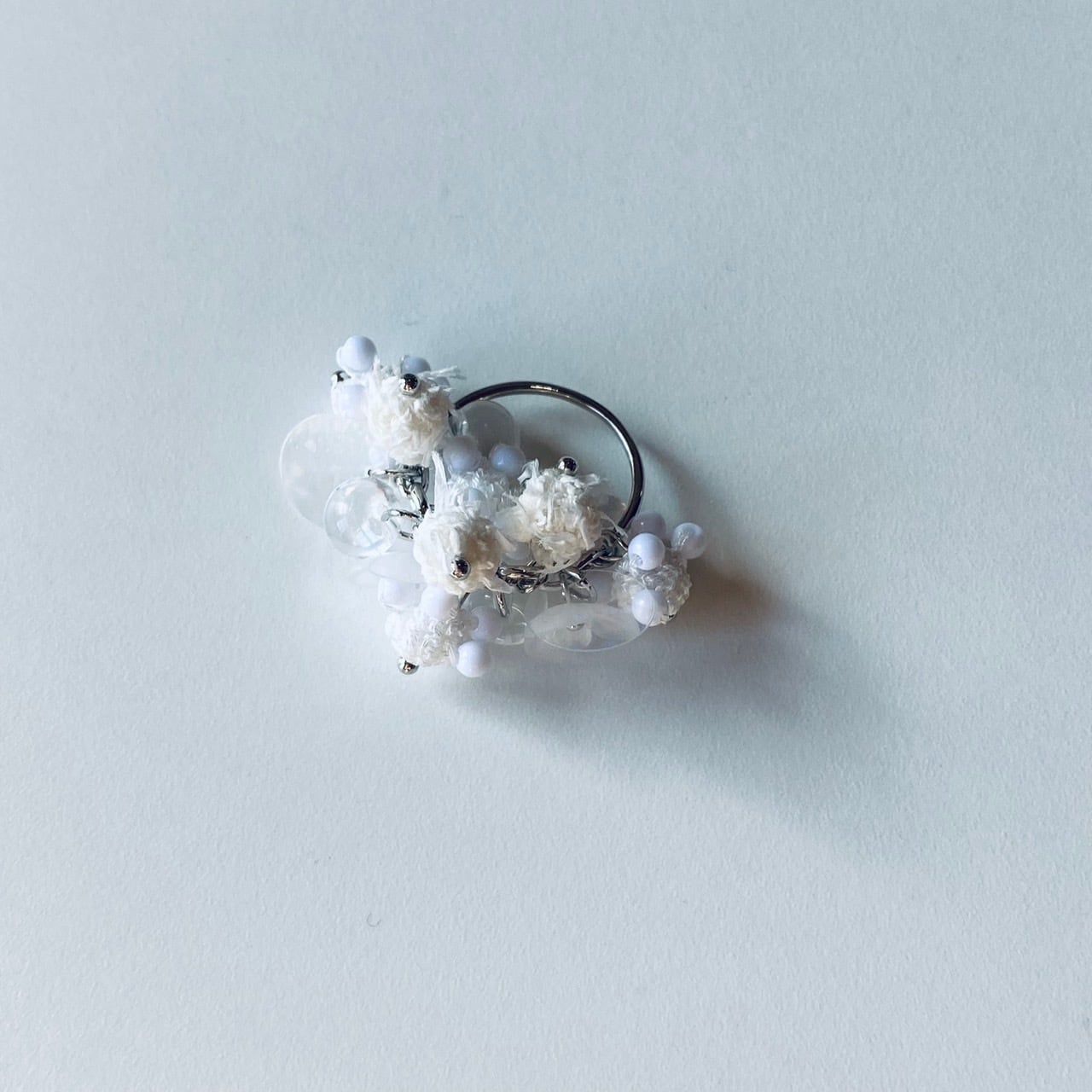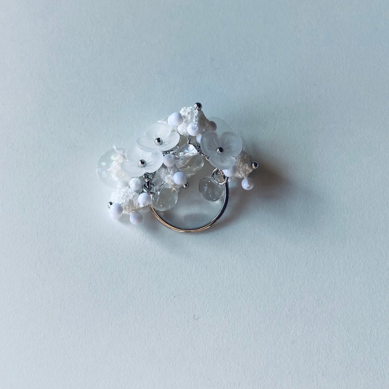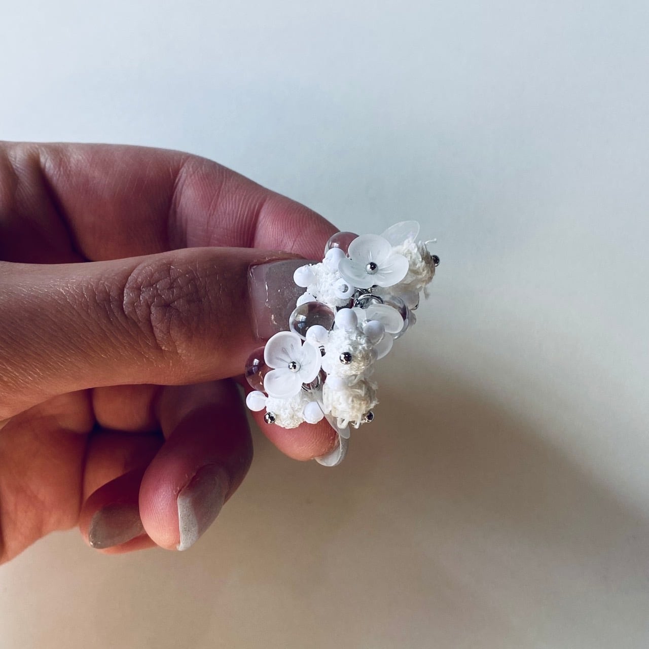 手編みで作られたボールや、スパンコール、手作業で色が塗られたお花のパーツがふんだんにあしらわれたリング。