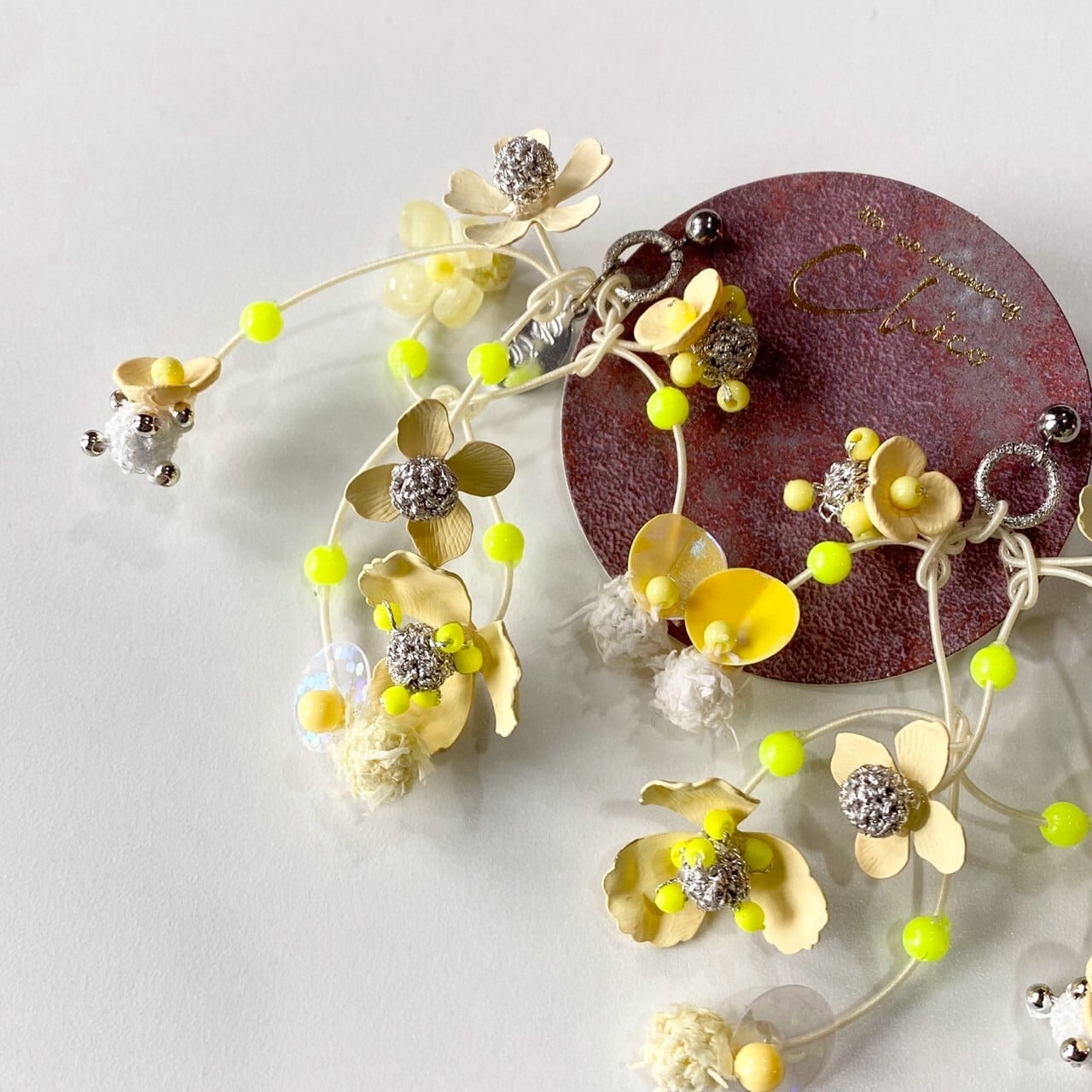一つひとつ編み上げられた玉や色付けされたお花、スパンコールが